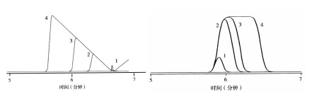 右圖:樣品體積對峰寬和峰型的影響,峰1到峰4,進(jìn)樣體積逐漸增大。