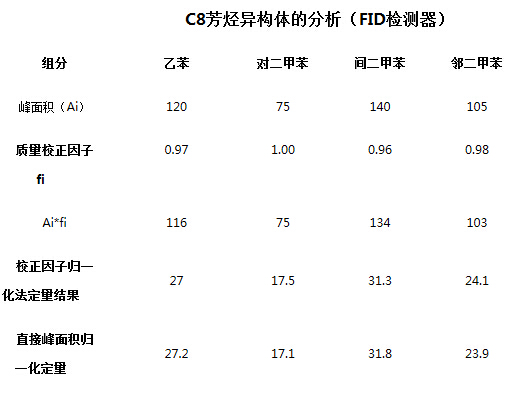 氣相色譜的一些主要檢測器如FID和TCD對某些組分,如同系物的校正因子相近或有一定的規律,從文獻中可以查到或進行計算。當校正因于相近時,可直接用峰面積歸一化進行定量分,例如下表中給出了C8芳烴異構體的分析結果。四個組分的FID檢測器的質量校正因子在0.96-1.00之間,結果給出了用校正因子進行歸一化法的定量結果和直接用峰面積進行歸一化的定量結果。