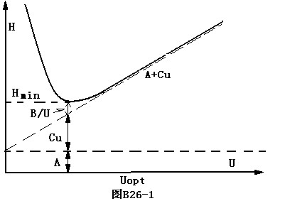圖B26-1 為H-u曲線,曲線上Hmin對應(yīng)最佳線速度Uopt,根據(jù)柱長L與塔板高度H的關(guān)系,理論塔板數(shù)n=L/H,在給定條件下,若在最佳流速下進(jìn)行操作,可獲得最高柱效。在曲線的最低點,塔板高度H最?。℉最小)。