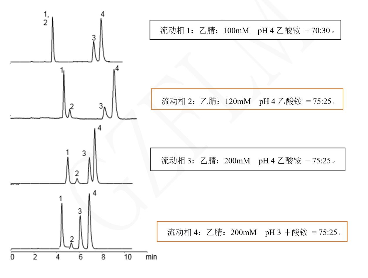 說明:本案例中乙腈比例及緩沖鹽種類和強度的變化帶來磷霉素與庶糖的0分離到完全分離的變化, 以及保留時間上的變化。