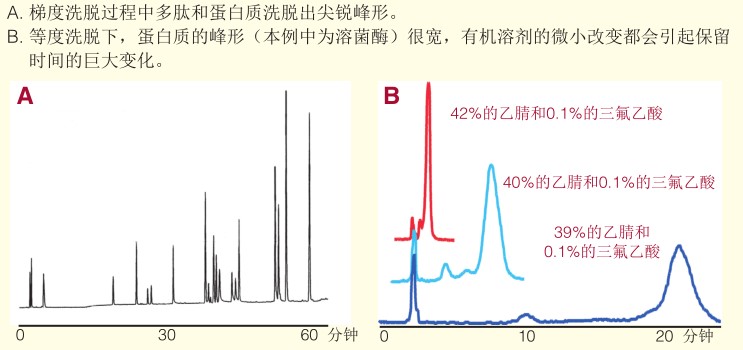 在RP-HPLC中,蛋白和多肽的保留和一般的小分子化合物有所不同,等度洗脫對于蛋白質的分離作用很小,有機相比例小的變化會引起蛋白質保留的大的變化。
