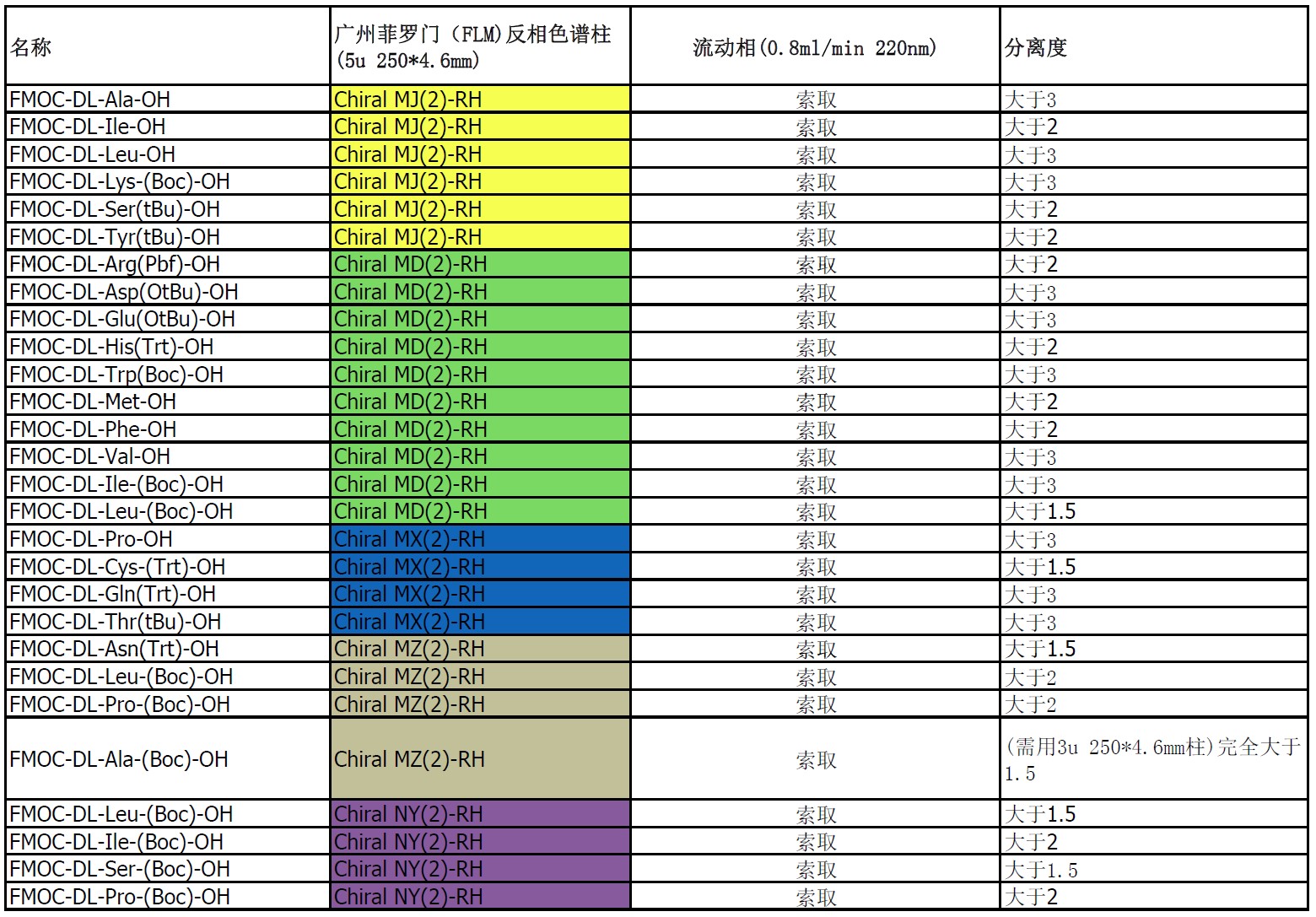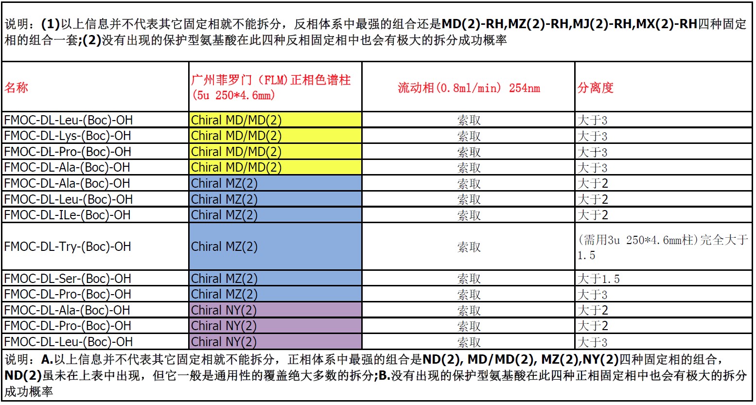 當氨基酸上的氨基和羧基用Boc和/或FMOC等保護起來時,可以用正相或者反相的多糖類手性柱實現非常好的分離,有現成的分析方法,可以極大地減少方法開發的時間。