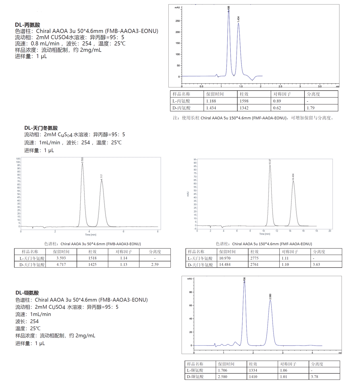 對于非保護的氨基酸,菲羅門推出AAOA分析柱,即通過鍵合D-青霉胺于十八烷基柱上而成的配體交換型手性柱。該手性柱手性柱可以用于拆分α-型有機酸、α-型非衍生氨基酸及其衍生物、二元胺、二肽、內酰胺和氨基醇等。