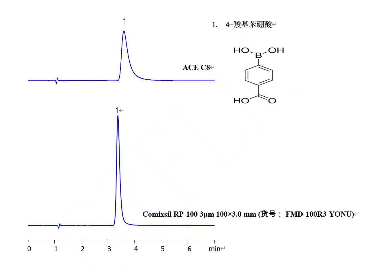 備注: 4-羧基苯硼酸可以在混合作用的 Comixsil RP-100 上獲得比常規反相柱(如 ACE C8) 更好的峰形。