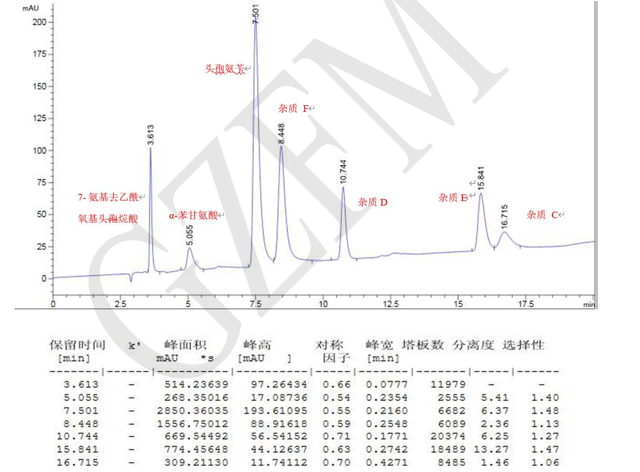 案例說明:7-氨基去乙酰氧基頭孢烷酸峰與ɑ-苯甘氨酸峰之間的分離度應符合要求;系統(tǒng)適用性溶液色譜 圖中,頭孢氨芐峰與相鄰雜質(zhì)峰之間的分離度應符合要求。