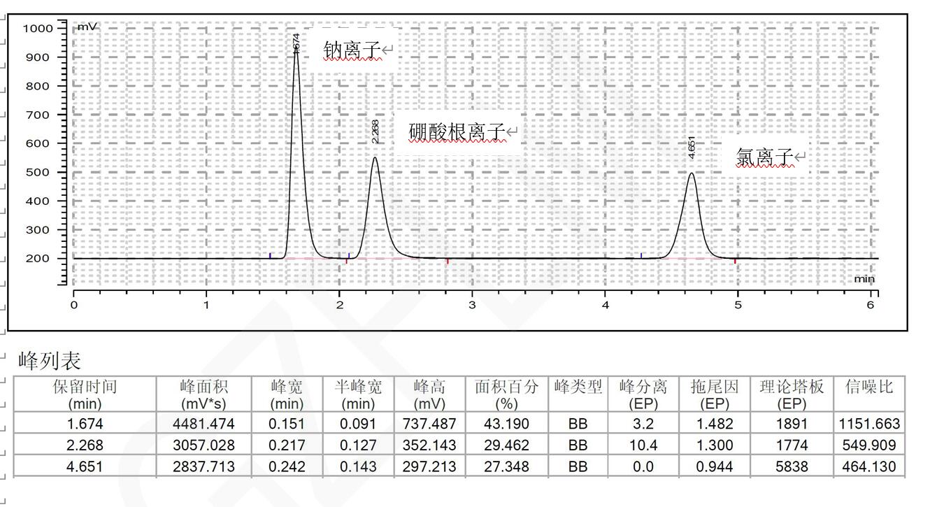 方法說(shuō)明:使用 Comixsil RP-AX ,利用陰離子交換保留硼酸根離子和氯離子,鈉離子由于陽(yáng)離子排