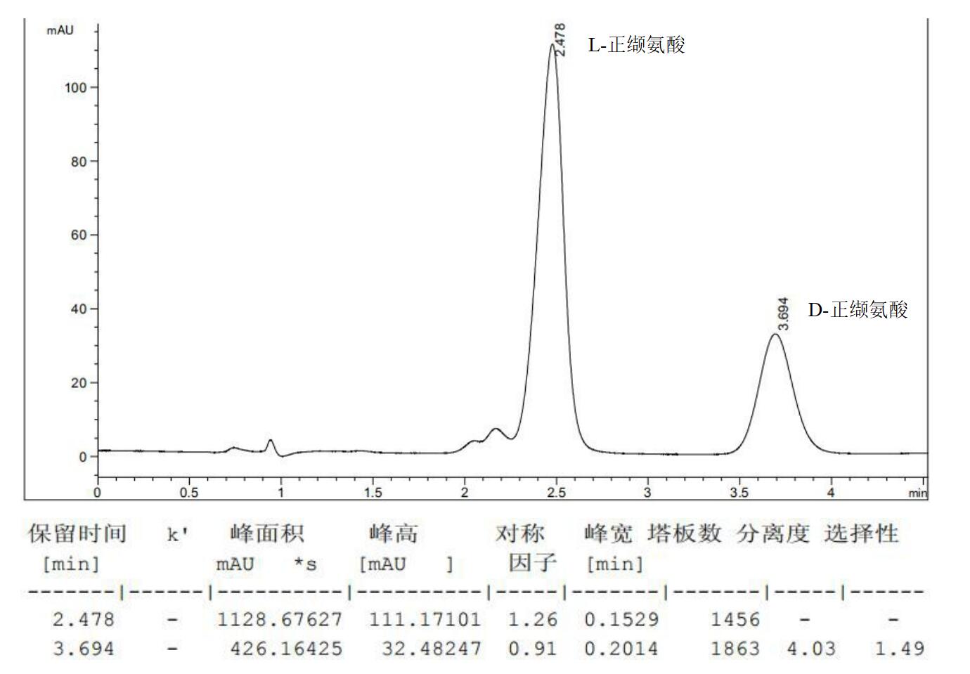 方法說明:使用 Chiral AAOA 可以能夠滿足 D、L-正纈氨酸的分離;推薦也可使用 Chiral AOAA-L (貨號:FMF-AAOAL-EONU)這款手性柱進行分離,出峰順序會與以上圖譜相反,但保留與分離度會更好。