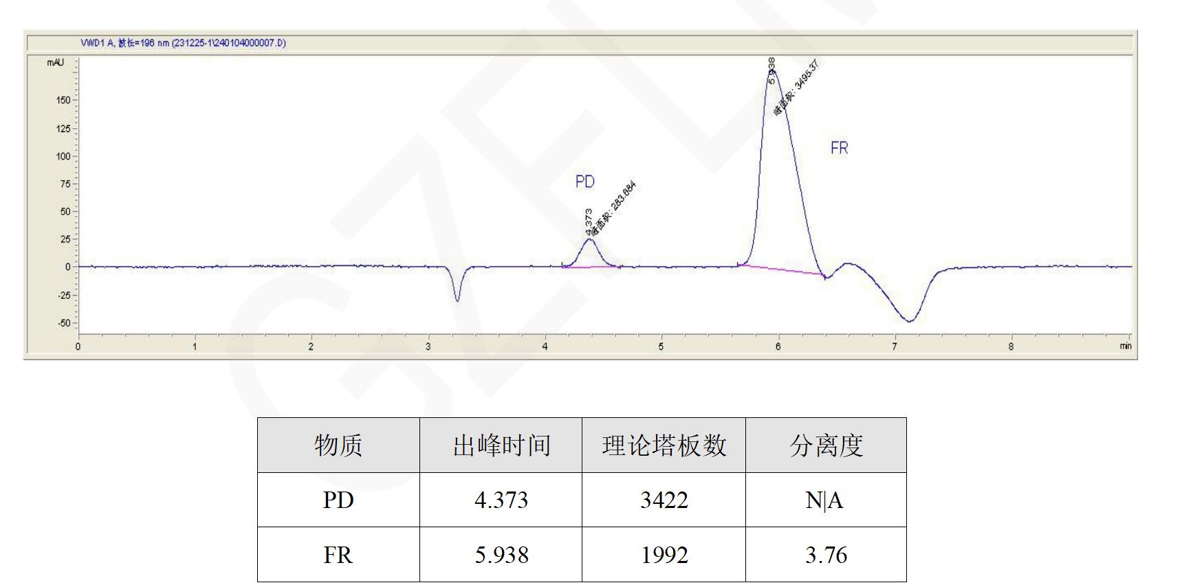 App ID: FLM-B240001 D-吖啶-2-羧酸異構(gòu)體分離 方法:自訂 色譜柱:Chiral AAOA 5u 250*4.6mm(貨號(hào):FMG-AAOA-EONU ) 流動(dòng)相: 2mM 硫酸銅:IPA=95:5 流速:1ml/min 進(jìn)樣體積:10 μL 檢測(cè)波長(zhǎng):196 nm 柱溫:25℃ ![]() |