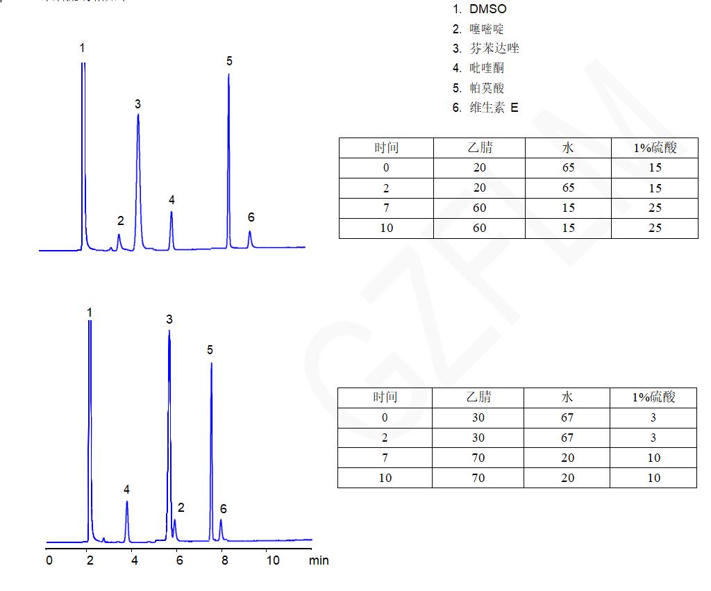App ID: FLM-C240009 Comixsil ACRP 同時分析獸藥噻嘧啶、芬苯達、唑吡喹酮等 方法:自定 色譜柱:Comixsil ACRP 3u 150×4.6 mm(貨號:FMF-ACRP3-EONU) 流速:1.0 mL/min 檢測器:215nm 詳細流動相如下: ![]() |