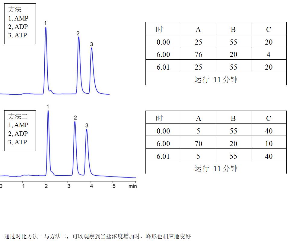 1. **色譜圖**: - 通過色譜圖可以直觀地看到AMP、ADP和ATP的分離情況。每個化合物在色譜圖上都有一個特定的保留時間,這是其身份識別的關鍵依據。