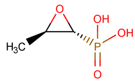 左旋磷霉素(1R,2S)-1,2-環氧丙基膦酸,其光學對映體(1S,2R)-1,2-環氧丙基膦酸,亦即右旋磷霉素。 左旋磷霉素是一種小分子大極性廣譜抗生素。最早是在1969年從弗氏鏈霉菌(Streptomyces fradicle)的發酵液中發現的天然體。其結構簡單,抗菌機制獨特。對革蘭氏陽性和陰性菌有效。主要用于敏感的革蘭陰性菌引起的尿路、皮膚及軟組織、腸道等部位感染。 左旋磷霉素現已實現化學工業合成,右旋磷霉素是在合成左旋磷霉素過程中產生的無臨床活性的對映異構體。