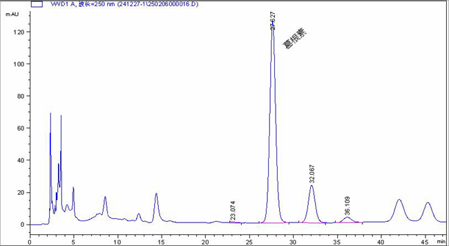 App ID: FLM-S250001 SuperLu C18 柱對葛根的含量測定 方法:中國藥典一部 色譜柱:Superlu C18 5μ 250*4.6mm (貨號:FMG-5252-EONU) 流速:1 mL/min 樣品濃度:1 mg/mL 進樣量:10μ 檢測:250nm 流動相:甲醇:水=25:75 色譜圖: