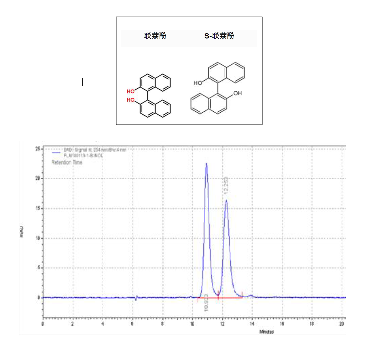 App ID: FLM-B250006 聯(lián)萘酚與S-聯(lián)萘酚的分離 色譜柱:Chiral INC 250*4.6mm,5um (貨號(hào):FMG-JY5-I03) 流速:0.5 mL/min 檢測(cè):波長(zhǎng)254nm, 柱溫:25°C 樣品濃度:N/A 進(jìn)樣量:1μ 溶劑:水:甲醇=40:60(V:V) 流動(dòng)相:咨詢銷售