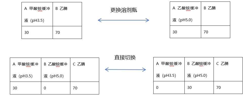 Part 2 三元泵相比二元泵的優勢 1. 便于對比不同種類或pH的流動相 在開發一個新的分析方法時,通常需要篩選不同的溶劑組合以找到最佳分離效果。例如,可能需要嘗試: 不同pH的緩沖液:比如甲酸銨緩沖液(pH3.5)和乙酸銨緩沖液(pH 5.0)。 不同的有機相:比如甲醇和乙腈,它們的洗脫強度和選擇性不同。 對于二元泵,如果你想從“乙腈-甲酸銨緩沖液(pH3.5)”切換到“乙腈-乙酸銨緩沖液(pH 5.0)”,你必須手動更換泵B的溶劑瓶,并從泵A的瓶子中倒掉舊的緩沖液,更換新的緩沖液。這需要停機、沖洗系統、重新平衡,非常耗時且容易出錯(如產生氣泡、殘留污染)。