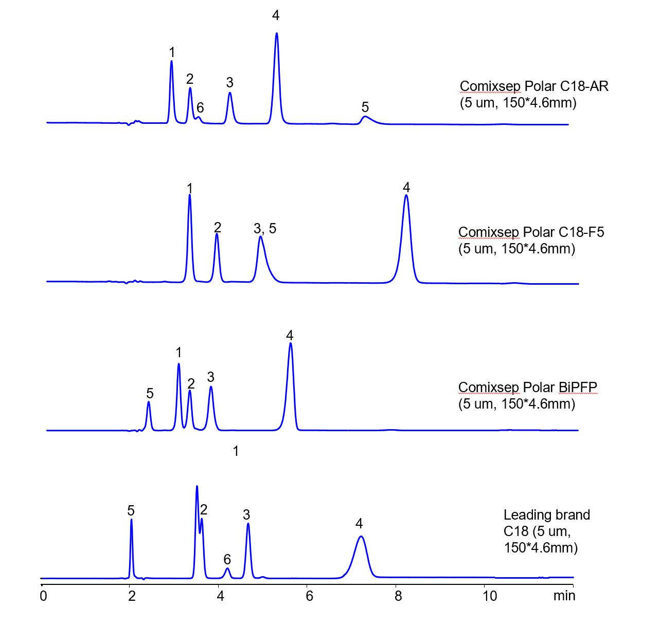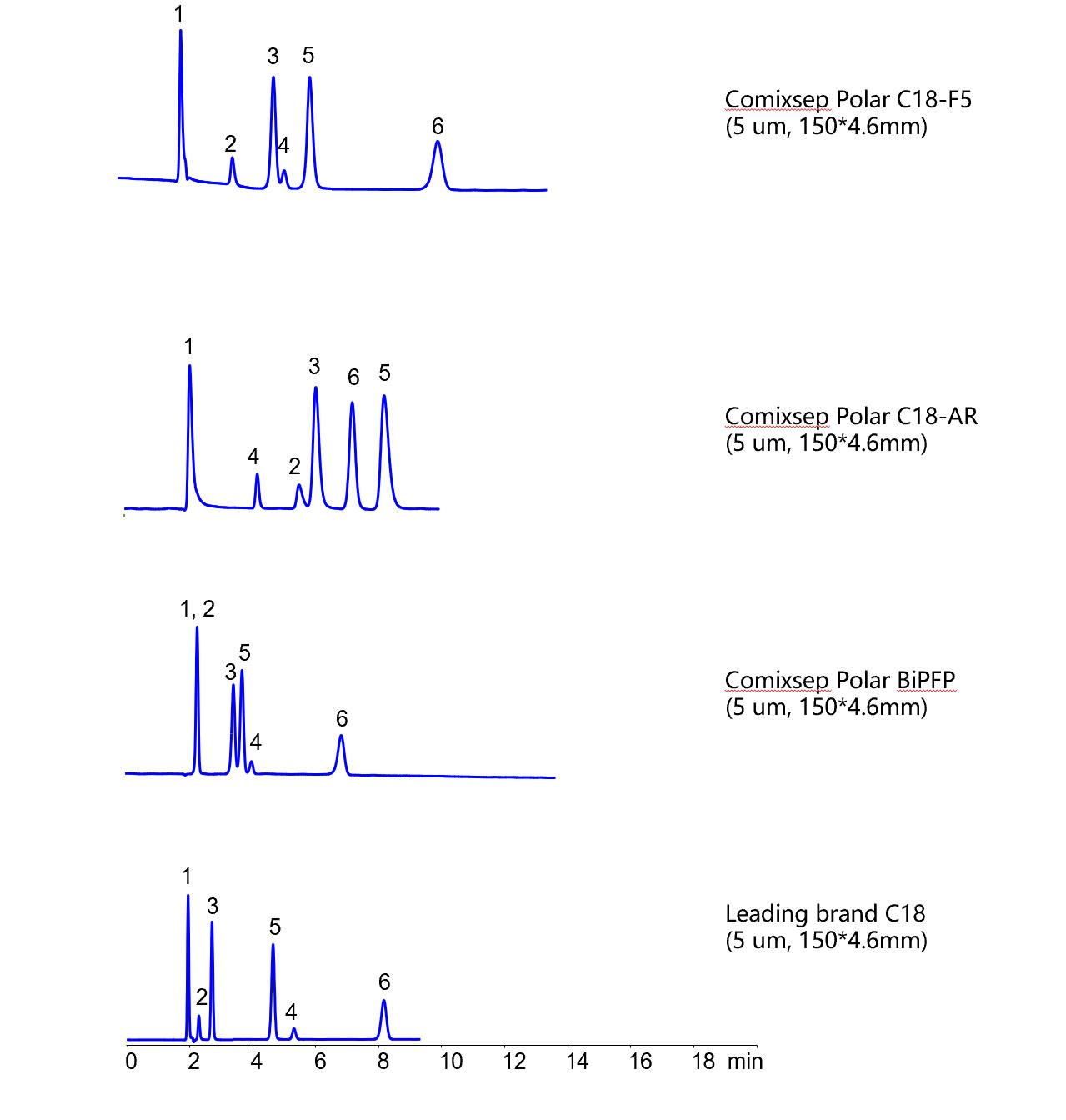 Comixsep復合反相固定相方法包為三款規(guī)格一致的互補固定相(Polar C18-F5, Polar C18-AR和Polar BiPFP)的組合,通過選擇性的科學互補,方便在HPLC方法開發(fā)時固定相的篩選,最大化提升方法開發(fā)的效率和成功率,是HPLC方法開發(fā)的有力工具。