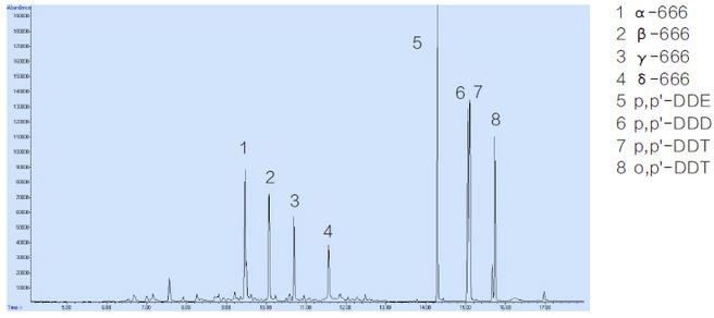 八種農(nóng)殘標(biāo)準(zhǔn)品:α-666(CAS: 319-84-6),β-666(CAS: 319-85-7),γ-666(CAS: 58-89-9), δ-666(CAS: 319-86-8),p,p'-DDE(CAS:72-55-9),p,p'-DDD(CAS:72-54-8),