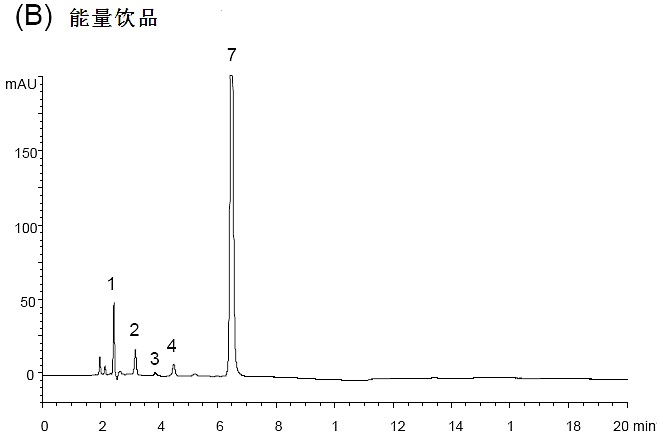 進樣體積:4μL(標品濃度為 50μg/mL;能量飲品用乙腈/水(80/20)稀釋 10 倍)