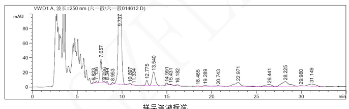 中國藥典規(guī)定理論塔板數(shù)按甘草酸銨應(yīng)不低于3000,本試驗實際測出柱效為6143。