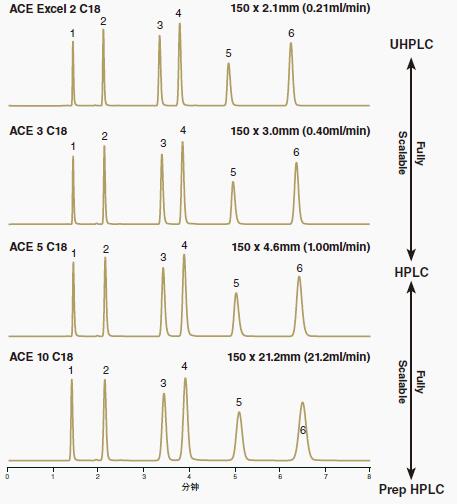 圖 15:ACE固定相可以提供相同的選擇性,無論它們是UHPLC、HPLC還是制備型HPLC色譜柱