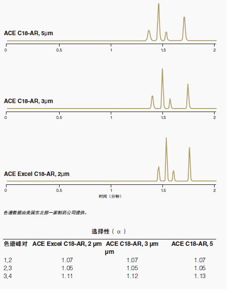 試驗樣品的這些色譜圖在ACE Excel C18 2μmUHPLC色譜柱、ACE C18 3μmHPLC色譜柱和ACE C185μm色譜柱上以相同的流動相條件運行,結果闡明ACE固定相的選擇性一致,無論填充粒徑如何。