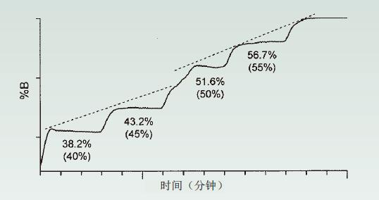 圖8. 圖9顯示了HPLC系統(tǒng)的梯度階梯測試結(jié)果。(a)0、10、20、30、40、45、50、55、60、70、80、90和100%B的梯級;(b)以1%的梯級向上跟蹤至45-55%。箭頭顯示了50和51%之間的“較短”梯級。來源[4]。