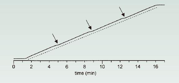 圖9. 故障比例閥線性梯度圖。箭頭顯示線性偏離;繪制下面的虛線以供參考(虛線為標準參考線)。以1mL/min的速度運行梯度0-100%B 15分鐘;A =水、B = 0.1%丙酮水溶液;檢測UV 265nm。來源[4]。