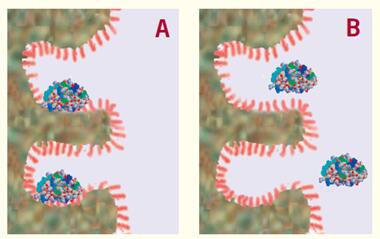 圖4. 進入色譜柱的蛋白質被吸附在柱頂端附近的疏水表面上(A)并且一直保持吸附,直至有機改性劑的濃度達到特定值,此時蛋白質從表面解吸附(B)。